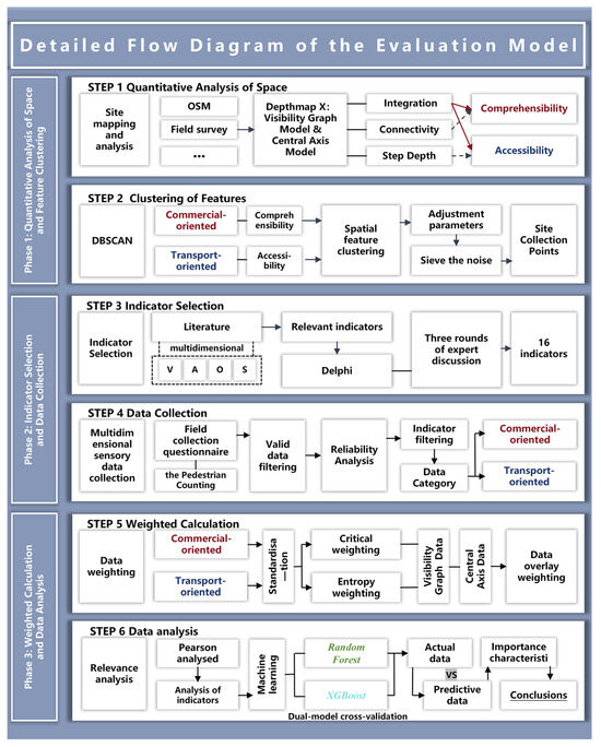 The research is summarised as follows: In Quantitative Spatial Analyses, the OSM data are utilised for precise spatial mapping. Space Syntax is a reliable tool for analysing spatial structures at both the meso and micro scales, effectively quantifying spatial data. Additionally, the DBCAN algorithm plays a fundamental role in classification through its clustering capabilities. Regarding Multidimensional Sensory Perception, the indexes derived from documentary analysis and the Delphi Method effectively reflect pedestrians’ sensory experiences, yielding more intuitive evaluation results. In the context of Machine Learning Algorithms, the computational features of Random Forest and XGBoost models are employed to efficiently process complex, multidimensional datasets and analyse the relationships between spatial quantification tools and the significance of spatial quality indicators within the framework of Multidimensional Sensory Perception.