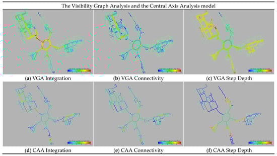 Depthmap X was employed to construct the VGA and CAA models, from which the Integration, Connectivity, and Step Depth data were obtained, as shown in Figure 5. The spatial quantitative data from this study were superimposed and analysed using a multi-model computational approach. The intensity of the red colour indicates higher corresponding values. Integrating the two models shows that while the overall numerical trends are similar, distinct results emerge in local areas. For example, in the depth map, the position of the highest depth value in the Step Depth shifted from the VGA model’s northern end to the CAA model’s southern end. This shift may be attributed to the limitations of a single model calculation, which cannot adequately generalise the complexities of the natural environment. In contrast, integrating the two models facilitates a more comprehensive quantification of the spatial structure.