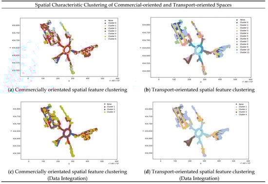 The data derived from the VGA model are classified into ‘Commercial-oriented’ and ‘Transport-oriented’ dimensions. These classifications correspond to the superposition of Integration and Connectivity and the superposition of Integration and Step Depth. The unsupervised autonomous learning method of DBCAN is utilised to extract the point characteristics associated with both the ‘Commercial-oriented’ and ‘Transport-oriented’ dimensions. To present the feature clustering results under these two distinct dimensions more objectively (as illustrated in Figure 6), EPS (Eps-neighborhood of a point) is determined to be 3.8 after several rounds of testing. Following the removal of noise for similar types of integration, the resulting point distribution exhibits significant features In the plan view, which can be utilised for data collection point positioning.