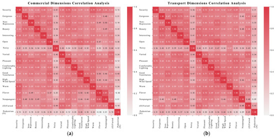 (a) The Correlation coefficient matrix of all the multidimensional sensory indicators (Commercial-oriented space). (b) The correlation coefficient matrix of all the multidimensional sensory indicators (Transport-oriented space).