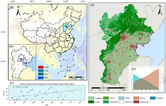 (a) Map of the Beijing–Tianjin–Hebei region. (b) Temporal and spatial changes in built-up areas, (c) surface temperature changes, (d) land cover, and (e) proportions of built-up areas and blue-green spaces.