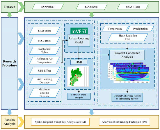 A flowchart of the process followed in this study is shown in Figure 2. After data pre-processing, the InVEST UCM was utilized to assess the integrated heat reduction index of blue-green spaces in the study area for each year from 1990 to 2020. The intra- and inter-annual variations of the HMI of the composite blue-green spaces from 1990 to 2020 were analyzed, to which the wavelet coherence method was applied to explore the factors that influenced the modeled changes.