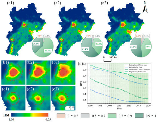 Distributions and spatial changes in the heat mitigation index (HMI) in the (a1–a3) Beijing–Tianjin–Hebei region, (b1–b3) local Beijing, and (c1–c3) Shijiazhuang urban areas from 1990 to 2020. (d) Annual time-series graphs of the Beijing and Shijiazhuang urban areas and their peripheral buffer zones (each decade is defined as a stage).