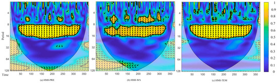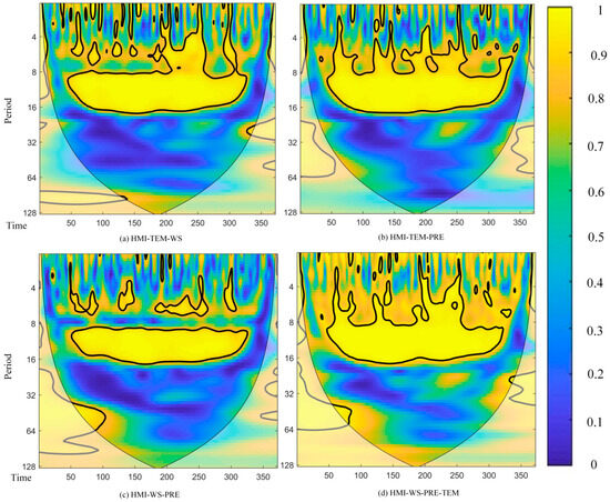 - The HMI exhibited coherence with environmental factors that was mainly reflected at the hourly time–frequency scale. The main factors controlling the HMI varied on different time–frequency scales. Overall, the inclusion of four variables demonstrated the best coherence (AWC of 0.82). These variables were the most effective explanatory variables for changes in the HMI. The individual variable that best explained the changes in the HMI was air temperature, while the best bivariate combination was air temperature and wind speed.