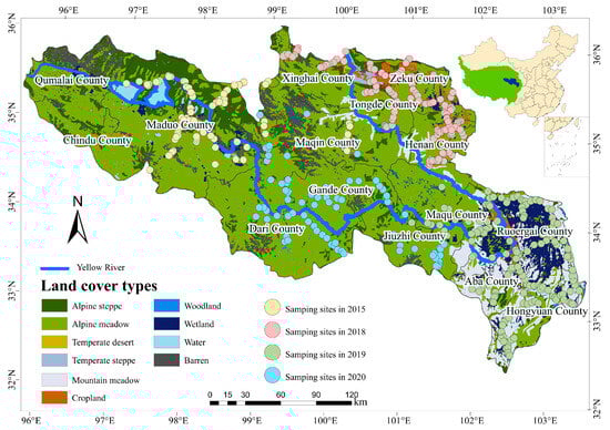 The layout of land cover types and sampling sites from 2015-2020 across the SRYR.