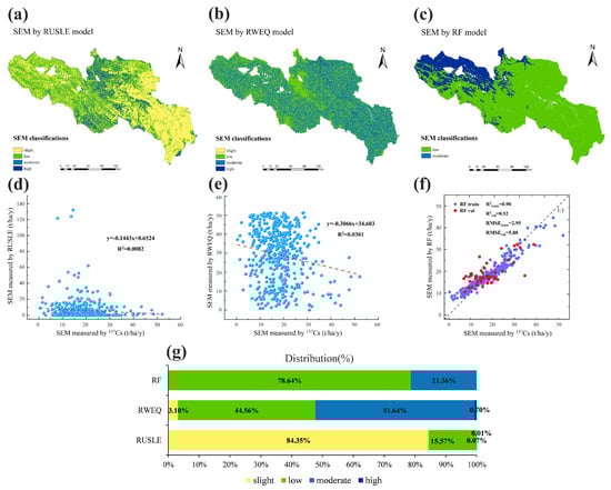 As seen from the scatter fitting diagram (Figure 2f), the R2train value for the training set was 0.9, close to 1, and the RMSE for the training set was 2.95, indicating that the RF model’s regression performance was robust and the model was deemed reliable. The annual average SEM in the SRYR calculated by the RF model was 19.32 t·ha−1·y−1, contributing to a total erosion volume of 5.18 × 106 t·y−1, indicating low erosion in the SRYR. The RF model’s classification results for soil erosion in the SRYR were consistent with those from the RUSLE model and the RWEQ model. However, SEM calculated by the RF model fell between those of the RUSLE and the RWEQ model. The SEM in the southeast was low, while it was high in the northwest, indicating a decrease in erosion intensity from northwest to southeast. The SRYR was mainly characterized by low erosion as well as moderate erosion, covering 78.64% and 21.36% of the study area, respectively.