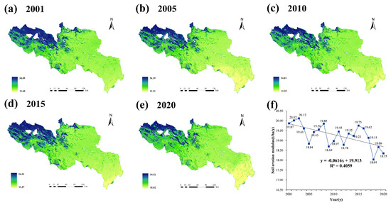 Spatial distribution of SEM in SRYR in 2001 (a), 2005 (b), 2010 (c), 2015 (d), 2020 (e). Temporal changes of SEM in SRYR between 2001 and 2020 (f).