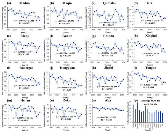 Temporal changes in SEM across each county in the SRYR from 2001 to 2020: Maduo (a); Maqin (b); Qumalai (c); Dari (d); Maqu (e); Gande (f); Chindu (g); Xinghai (h); Ruoergai (i); Hongyuan (j); Jiuzhi (k); Tongde (l); Henan (m); Zeku (n); Aba (o). Average soil erosion modulus for each county from 2001 to 2020 (p).