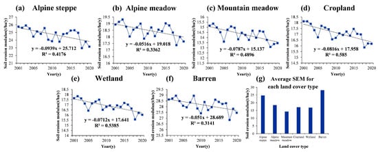 Temporal changes in SEM across main land cover types in the SRYR from 2001 to 2020: Alpine steppe (a); Alpine meadow (b); Mountain meadow (c); Cropland (d); Wetland (e); Barren (f). Average soil erosion modulus for land cover types mentioned above from 2001 to 2020 (g).