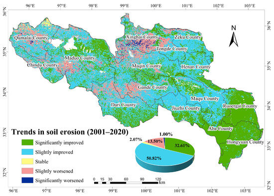 The dynamic trend of soil erosion in the SRYR between 2001 and 2020 (Figure 6) was determined using the Sen trend analysis in conjunction with the Mann–Kendall test. Over the last 20 years, the soil erosion conditions have generally improved in the SRYR. The improved area accounted for 83.43% of the entire study area, with 32.61% of the area showing significant improvement, mainly in the southeast. The slightly improved area accounted for 50.82% and was spread throughout the entire study area. Only 2.07% of the SRYR remained stable, primarily distributed in the northwestern region. Conversely, the area experiencing worsening conditions accounted for 14.5%, with 13.5% undergoing slight worsening, particularly in the northwest of Qumalai, the south of Xinghai, and the east of Maduo and Gande. The significantly worsened areas made up 0.99%, mostly concentrated in the central part of Xinghai.
