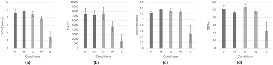 GLM analysis (see Table S1 in Supplementary Materials) showed that the soil coverage condition, rather than the humus system, had a significant impact on the number of taxonomic groups, the Shannon index and the QBS-ar index. Pairwise comparisons revealed that B and M were significantly different (p < 0.05) in both the number of groups and the Shannon index, with B showing lower values for all indices.