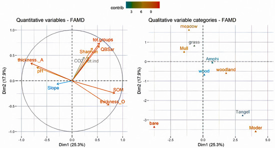 Two clusters of qualitative variables in the different dimensions of the FAMD graph could be observed in Figure 4, with M and G and the Mull humus system grouped together, and Mull correlated with the thickness of the A horizon and pH. On the opposite side of the graph, IF and W are grouped together with the Amphi humus system. These variables correlated with the SOM and the thickness of the O horizon. The soil coverage condition B diverged from all the others, appearing to be negatively associated with all the soil arthropod variables and soil respiration. The slope of the site had relatively little importance in contributing to the principal components. Regarding humus systems, the Moder and Tangel cluster diverged from the rest of the humus systems, correlating positively with the SOM and the thickness of the O horizon.
