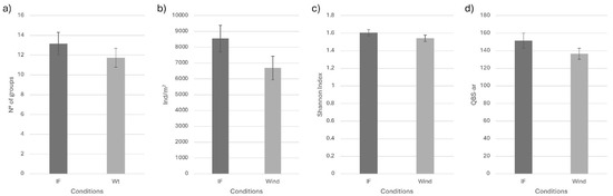 Despite the fact that neither the soil coverage condition nor the humus system was significant in predicting microarthropod parameters, there was a consistent tendency toward lower values in Wt compared to IF for the following variables (Figure 6a–d): total number of groups, total abundance, QBS-ar index and, to a lesser extent, the Shannon index. Similarly, soil respiration (g(CO2) m−2 h−1) also exhibited a consistent decrease in Wt (1.85 ± 0.15) compared to with IF (2.70 ± 0.48).