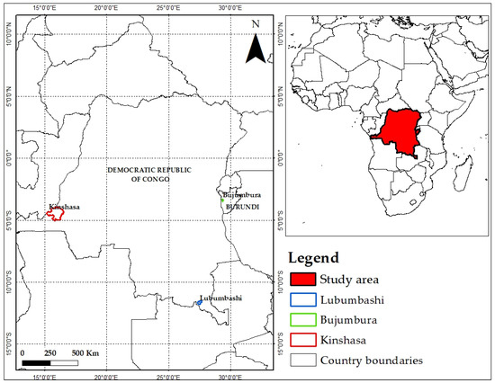 This study was conducted in three cities: Bujumbura, Kinshasa, and Lubumbashi (Figure 1). The city of Bujumbura was founded in 1897 on the shores of Lake Tanganyika by the Germans on a site called Kajaga. It is situated in the western part of the Republic of Burundi, between 3°30′ and 3°51′ S and 29°31′ and 29°42′ E. Bujumbura covers 10,462 hectares and comprises three communes (Table 1), which are subdivided into 13 administrative entities. These entities are set up as urban areas. The city-province of Kinshasa, founded in 1881 by explorer and journalist Henry Morton Stanley on the southern bank of the Pool Malebo, is located in the western part of the Democratic Republic of Congo, between 4° and 5° S and 15°–16° E, and covers an area of 9965 km2. Since 1968, it has been administratively subdivided into 24 communes (Table 1). For this study, the rural commune of Maluku was excluded from the analyses, not only because of its size (it alone covers an area of 82.8% of the entire city of Kinshasa) but also because of the lack of cloud-free multi-temporal images [28]. The city of Lubumbashi and its outskirts are located in the province of Haut-Katanga in the southeastern part of the Democratic Republic of Congo. It covers an area of almost 747 km2 and is located between 11°27′ and 11°47′ S and 27°19′ and −27°40′ E, and it comprises 7 communes. The town was created in 1910 following the discovery and development of large copper deposits by the Haut-Katanga Mining Union (HKMU) and is the capital of Haut-Katanga province (Table 1).