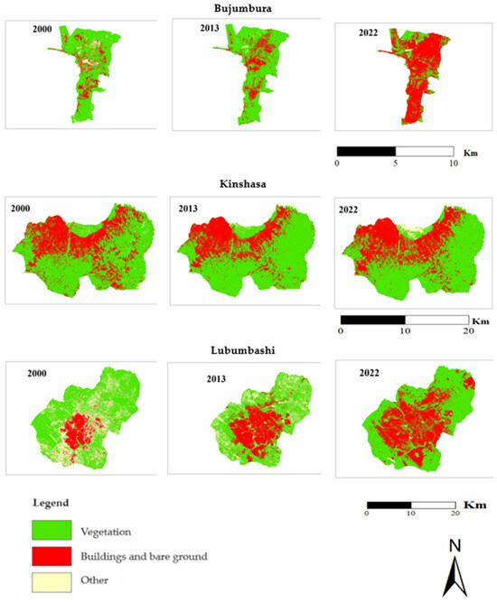 A visual analysis of the land-use maps reveals significant spatial changes in the landscape of Bujumbura and Lubumbashi between 2000, 2013, and 2022. These changes are evidenced by a regression of the “vegetation” class and the “other” class, which have been replaced by the “built-up” class. In contrast, the city of Kinshasa exhibited minimal change (Figure 2).