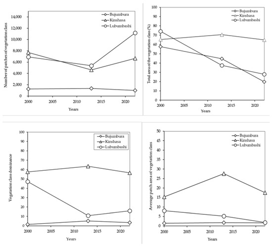 Figure 3 shows the evolution of the spatial structure indices calculated for the vegetation class of the cities of Bujumbura, Kinshasa, and Lubumbashi for the years 2000, 2013, and 2022.