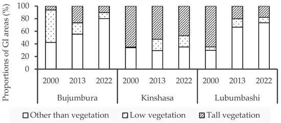 Proportions of GI areas over NDVI intervals were found for the cities of Bujumbura, Kinshasa, and Lubumbashi for the years 2000, 2013, and 2022.