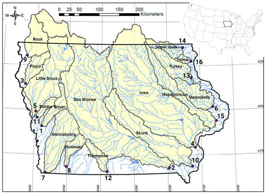 P is exported from Iowa in river water flux. There are 16 locations near Iowa’s border where waterborne P has been measured routinely since 1998 (Figure 1). These sites represent the farthest downstream points along Iowa’s major rivers where water quality P data have been collected. All of Iowa’s prominent waterbodies and over 90% of its area are captured within the watersheds of these 16 locales. Every site also has a co-located United States Geological Survey (USGS) stream gauge that monitors streamflow. Each stream gauge has continuously operated since 1998, resulting in robust, uninterrupted records of daily streamflow. Previous nutrient estimates have summed loads from these 16 locations to generate statewide totals [].
