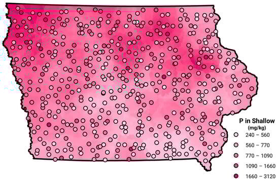 The most comprehensive effort to quantify the presence of various chemicals in Iowa’s soil occurred through The Iowa State-Wide Trace Element Soil Sampling Project—published in 2010 as part of the more extensive USGS Geochemical Survey []. This project involved collecting soil samples at 532 locations that were uniformly distributed across the state (Figure 2) and analyzing the samples for a number of parameters, including P. The first horizon (shallow) contained the top 0.25 m of soil, while the second horizon (deep) spanned from a depth of 0.25–0.61 m. The concentration of P in the soil was measured in both the shallow and deep horizons at all 532 sites. All soil P concentrations were above the detection limit.