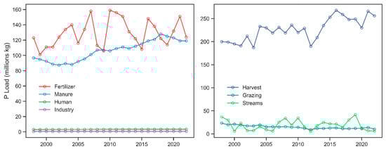 P output was estimated over the same timeframe as the P inputs (1998–2022) and considered crop harvesting, livestock grazing, and stream export.