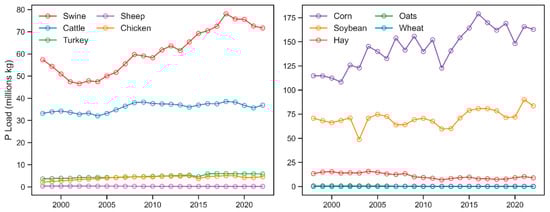 Another assumption of the budget was that the multiplicative factors used to calculate budget components have remained constant from 1998 to 2022. These factors include the per capita P corresponding to industrial and human sources and the P content of crops and livestock manure. Improvements in wastewater treatment have occurred in Iowa since the initial release of per capita P guidelines [], suggesting our budget marginally overestimates industrial and human P. Biological engineering may have altered the standard P content with the state’s crops [], and changes to livestock feed additives may have done likewise to livestock manure [].