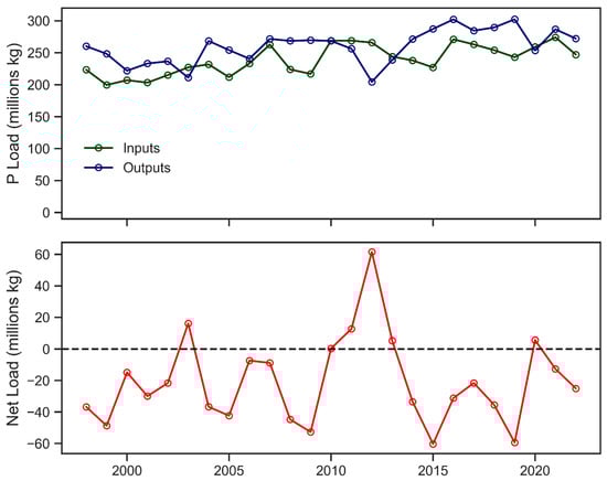 Summing the input and output loads indicates that both input and output totals were consistently above 200 million kg of P per year (Figure 5, top). Both inputs and outputs were increasing over the budget’s timeframe. The net balance of P was estimated by subtracting annual outputs from inputs (Figure 5, bottom). In most years, the net P balance results in a P deficit, meaning that more P exits its landscape than enters it. However, a P surplus was evident in a few years near 2010. Overall, the P net balance estimates suggest that P outputs exceed inputs by approximately 11%.