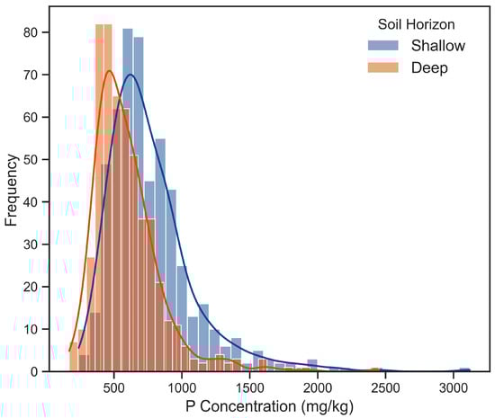 Histograms of soil P concentrations in the shallow and deep horizons. A 2-sample t-test indicated significant differences (p < 0.01) in P levels between the two depths.