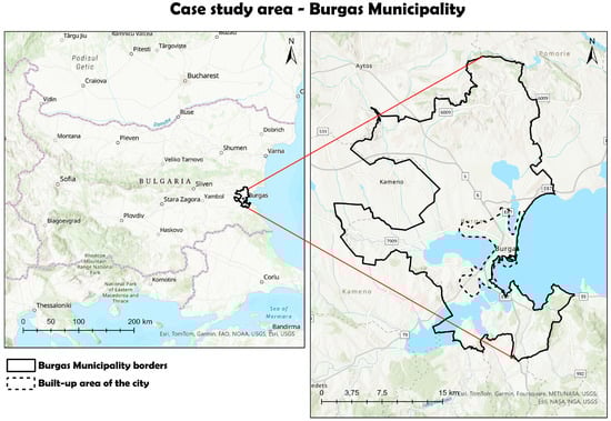 Burgas City is a functional urbanized area center with major industrial, transport, and tourist functions in South-Eastern Bulgaria. Burgas is located on the coast of Burgas Bay on the southern Black Sea coast (17 m a.s.l.) and experiences a continental Mediterranean climate (Cfa). It is the second largest urbanized area (254 km2) after the metropolitan city of Sofia, and hosts 4% of the country’s urban population [32]. It is distinguished by an over-concentrated urban core developed around a port, with annexed settlements from the agricultural periphery that are now important residential districts. The urban structure is set among three coastal lakes and the Black Sea (the city is surrounded by the largest complex of seaside lakes in the country) [33] (Figure 1). Its territory is distinguished by a concentration of protected areas of national and European importance.