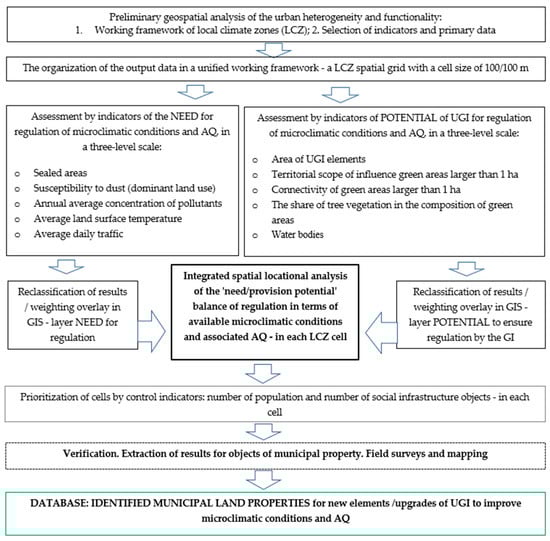 Phase 3: Integrated spatial location analysis. This stage has three steps, as follows: 1. assessment by 5 indicators of the ‘need’ for regulation of microclimatic conditions and AQ, and assessment by 5 indicators of the ‘potential’ of UGI to ensure regulation of microclimatic conditions and AQ; 2. weighting overlay in a GIS by thematic grouping of the results of the evaluation of the indicated indicators for each cell of the LCZ; and 3. reclassification of the results and the identification of the ‘need/provision potential’ ratio for each LCZ cell—the aim being to identify cells in which there is a high need for AQ regulation, but a low available UGI potential.