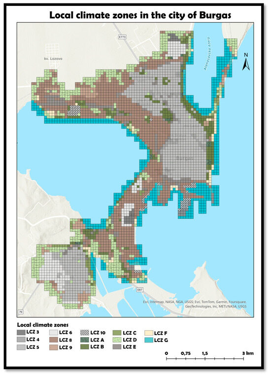 For the integrated locational analysis, this study applies the Climate Classification Methodology for Urban Areas [35], which allows the analysis of key features of the urban space in a system of cells with the meaning of “local climate zones” (LCZs). This decision is based on the following arguments: LCZs reflect urban morphology in specific spatial combinations of built area types and adjacent land cover [35]. Among the most important arguments is the potential of the LCZ to reflect the prerequisites for microclimatic conditions and corresponding AQ in the heterogeneous urban structure against the background of climate regimes common to the urban space of Burgas. In addition, LCZs determine important characteristics of urban climate (temperature regime, including the urban heat island effect (UHI), and surface air circulation), air quality, and dust and pollutant retention conditions [36,37]. LCZs could facilitate the discussion and mapping of spatial PM pollution [38]. LCZs are an effective framework for discussing urban sustainability and climate neutrality. The versatility, simplicity, and objectivity of the LCA framework make it a promising tool for a wide range of applications in the future, especially in the field of climate-smart urban planning and design [39]. LCZs are used as the main information unit in the definition of the typology of urban ecosystems in the Methodology for assessment and mapping of urban ecosystems and urban ecosystem services in Bulgaria [40]. On this basis, green urban infrastructure has been assessed as a provider of regulating Ess in terms of AQ.