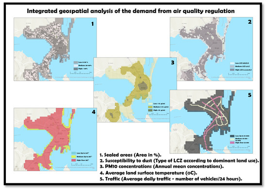 However, the specificity we are looking for—the size of areas, locations in the urban structure, and lasting cause-effect relationships for the AQ in that locality—is dependent on a proper selection of indicators to reflect urban conditions and sustainable sources of information. The selection of indicators in the geospatial analysis here is tailored to the capacity of urban governance to provide available data, to update the information, and to periodically assess (the LCZ approach further facilitates this) important spatial dependencies, functional causal relationships, and deficits in the mix of grey and green infrastructure. This flexibility of the methodology is much needed given the high propensity to change urban heterogeneity. In a subsequent extension of the study, we find it appropriate to incorporate information on wind direction and speed, building height and building orientation relative to wind direction, internal structural features of vegetation cover, and seasonal changes in vegetation cover.