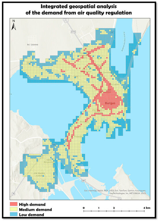 The spatial results of the thematic assessment of the indicators concerning the unfavorable preconditions and existing circumstances for the deterioration of the AQ are presented in Figure 4. The result is considered as degrees (low, medium, and high) of “demand to introduce measures to mitigate secondary spraying” (Figure 5). The aggregated results show a high vulnerability to dust pollution in the over-concentrated urban core and along major transport links. This is a complex result of the urban structure of Burgas in these ecological and geographical conditions and its modern functional specialization. However, with the greatest influence on the concentration of demand for air quality regulation in the central urban area are the high percentage of sealed surfaces (over 60%), the high values of pollution with PM (over 15 μg/m3), and the concentration on busy boulevards.