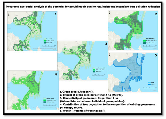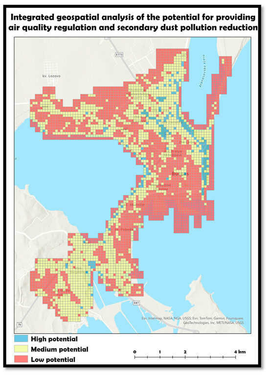 Integrated geospatial analysis of the balance “Air quality regulation demand and potential to reduce secondary dust pollution from the UGI”.
