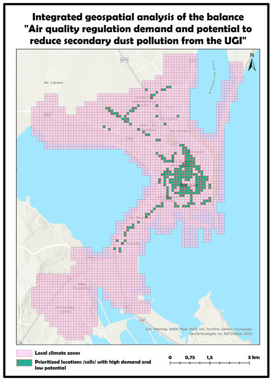 The outcome of this phase of the study is the identification of grid cells/LCZs with high and medium values of “demand for air quality regulation” but with low “potential for air quality regulation”—cells that are deficient in regulatory mechanisms to mitigate secondary sputtering and need to upgrade/rebuild air quality elements. The results of the integrated analysis found that in the central areas of the city of Burgas, there are compact areas along the main boulevards where it is necessary to implement measures to mitigate secondary dust pollution through the construction of elements of the UGI. These results have been used as the basis for the subsequent steps of prioritization of the areas and spatial definition of the sites/territories for targeted intervention to build the elements of the UGI (Figure 8).