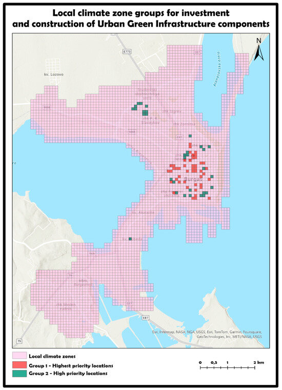As a result of the complex geolocalization analysis, two groups of priority spatial locations (a total of 79 grid cells/LCZs) have been identified for investment and construction of components of the UGI.