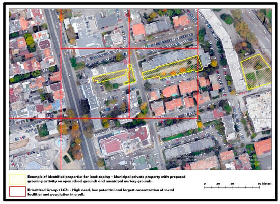 Based on the above-mentioned prioritized LCZs, in close proximity to/around, 174 properties (municipal ownership only) have been identified for future planned investments in UGI. The total area of the identified areas for landscaping in the mentioned properties is 15 ha. The results were discussed with the responsible parties from the Municipality of Burgas—emphasis was placed on the disturbed areas identified in the course of the field verification (bare surfaces without vegetation or disturbed pavements—a permanent source of dust pollution). Feedback was sought from the Landscaping Directorate regarding the qualitative characterization of the green elements and the health of the vegetation in the prioritized cells. It is recommended to study the results of targeted research [50] for the selection of species for afforestation that are drought-tolerant and disease-resistant in the climatic conditions of Southeastern Bulgaria.