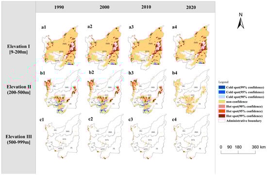 Distribution of cold hot spots of carbon storage in elevationI (a1–a4), elevation II (b1–b4), and elevation III (c1–c4) from 1990 to 2020.