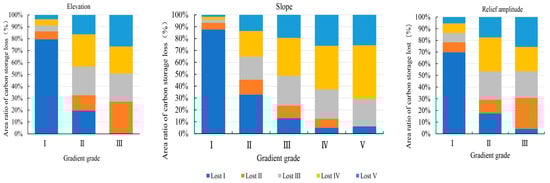 Based on the carbon storage loss from 1990 to 2020, the natural breakpoint method divided the loss into five levels: Lost I (−89.19 to −54.60 tons per hectare), Lost II (−54.60 to −41.64 tons per hectare), Lost III (−41.64 to −26.96 tons per hectare), Lost IV (−26.96 to −11.47 tons per hectare), and Lost V (−11.47 to 0 tons per hectare). Using ArcGIS 10.7 software, the five levels of carbon storage loss were overlaid with terrain factors, and statistical analysis was performed. The results indicated that carbon storage loss varies depending on topographic factors. Lost I showed the most significant loss among the different terrain factors, with its proportion exceeding 70% regardless of elevation, slope, or relief amplitude. Specifically, the largest loss of Lost I occurred at elevation I, where it accounted for 79.48%, while Lost II-V showed the most significant loss at elevation III, with more than 68%. Lost I had the highest proportion of loss in Grades I and II, making up 87.70% and 32.92%, respectively. In contrast, Lost IV had the highest proportion of loss in Grades III to V, reaching over 31%, with Grade V alone contributing to 45.08%. Lost I exhibited a relatively high loss in Relief Amplitude Grade I, accounting for 69.81%, while Lost III and IV showed higher losses in Relief Amplitude Grade II, contributing 24.13% and 29.15%, respectively. Furthermore, Lost II–V displayed a much higher loss in Relief Amplitude Grade III, accounting for more than 62%. In summary, the proportion of distribution area in the lost area decreased as the terrain gradient increased, exhibiting a sawtooth evolution trend, suggesting a strong dependence of the carbon storage loss on the topography elevation (Figure 5).