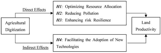 In summary, this study constructs a theoretical analysis framework to empirically examine the impact of agricultural digitalization on land productivity and further explores the underlying mechanisms, as illustrated in Figure 1.