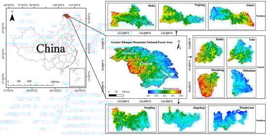 Location of the Greater Khingan Mountains National Forest Area in China, with subregions highlighted as northern, central, and southern.