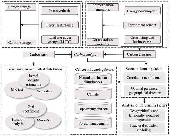 The analysis workflow in this study comprised three key steps (Figure 2). First, the forest carbon sinks were determined by the difference in forest carbon stocks between two time points, calculated using the volume-derived biomass method. Meanwhile, the direct and indirect carbon emissions from forest enterprises were computed using the carbon emission factor method. The carbon budget was then defined as the difference between the forest carbon sinks and the total carbon emissions. Second, trend analysis was conducted using methods such as the Mann–Kendall (MK) test, and spatial analysis was performed using hotspot analysis to explore the spatiotemporal patterns of the carbon budget. Finally, the influencing factors were identified through correlation analysis and the optimal parameter geographical detector (OPGD), while structural equation modeling (SEM) and geographical and the temporal weighted regression (GTWR) model were utilized to investigate the influencing factors of the carbon budget at both global and local scales.
