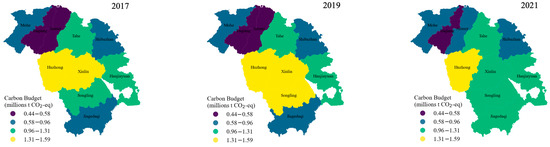 To better compare the spatial variations in carbon budgets across different forest enterprises during the study period, the Jenks natural breaks classification method was used to categorize the carbon budget data from 2017, 2019, and 2021 into four levels, where yellow represents areas with the highest carbon budget, green represents areas with a relatively higher carbon budget, purple represents areas with the lowest carbon budget, and blue represents areas with a relatively lower carbon budget. From the perspective of spatial distribution, the carbon budget of forest enterprises was high in the middle and low in the periphery, and the carbon budget of forest enterprises in the southern region was higher than that in the northern region (Figure 3). During the study period, Tuqiang was always in the lowest carbon budget area, Mohe and Shibazhan were in the relatively lower area, Tahe and Hanjiayuan were in the relatively higher area, and Huzhong was in the highest area. Compared with 2017, in 2019, Songling changed from a relatively higher carbon budget area to the highest carbon budget area. In 2021, the carbon budget of forest enterprises changed greatly compared with 2019, with Amuer converted from the lowest carbon budget area to a relatively lower area, Jiagedaqi converted from a relatively lower carbon budget area to a relatively higher area, and Xinlin and Songling converted from the highest carbon budget areas to relatively higher areas. Fifty percent of the forest enterprises had carbon budgets ranging from 0.96 to 1.31 × 106 t CO2-eq, indicating a convergence in carbon budgeting capacity.