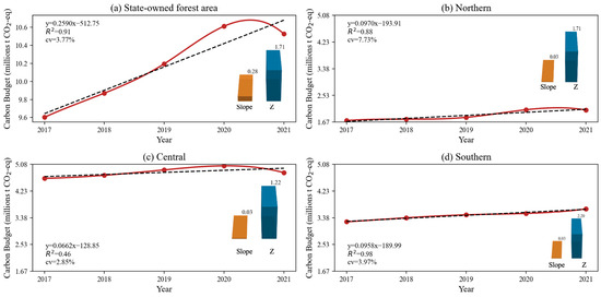 Trends of carbon budgets (2017–2021): (a) overall trend, (b) northern region, (c) central region, and (d) southern region.
