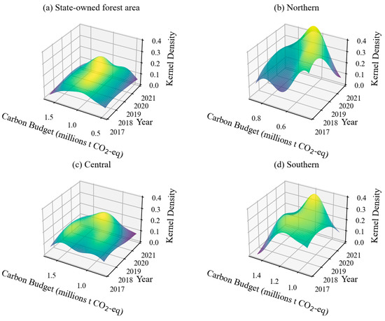 In order to further identify the dynamic evolution trends from 2017 to 2021 and determine the peak points in the carbon budget distribution (i.e., regions with high data frequency), the distribution densities of the carbon budgets of forest enterprise values in the whole study area and different regions (northern, central, and southern) were evaluated. The results are presented in Figure 5. The color gradient, ranging from purple to yellow, represents the concentration of the carbon budget values and year combinations. The closer the color is to yellow, the more densely distributed the carbon budget value is in the corresponding year. During the period of 2017 to 2019, the main peak of the carbon budget of forest enterprises in the entire study area was 0.96 × 106 t CO2-eq–0.98 × 106 t CO2-eq, with a small kernel density and a relatively stable carbon budget distribution. In 2020, the main peak of the carbon budget increased to 1.04 × 106 t CO2-eq, and the kernel density increased, which means that more forest enterprises achieved higher levels of carbon budgets. In 2021, the main peak further increased to1.22 × 106 t CO2-eq, and the kernel density continued to increase, indicating that the differences among forest enterprises in carbon budgets decreased. The main peak of the carbon budget in the northern region steadily increased from 0.49 × 106 t CO2-eq in 2017 to 0.67 × 106 t CO2-eq in 2021, indicating an upward trend. Compared to the entire forest area (Figure 4a), forest enterprises in the northern region had relatively lower carbon budgets. However, forest enterprises in the region displayed a steeper kernel density curve, indicating lower variability in the carbon budget. The main peak of the carbon budget for forest enterprises in the central region increased from 1.28 × 106 t CO2-eq in 2017 to1.30 × 106 t CO2-eq in 2021, but the increase rate was lower than that of the overall state-owned forest areas (Figure 4a). In the southern region, the main peak of the overall carbon budget exhibited fluctuations, with the lowest value of 1.08 × 106 t CO2-eq in 2020 and the highest value of 1.18 × 106 t CO2-eq in 2021, both of which were higher than those in the northern region. However, the kernel density of the southern region was less than that of the northern region, indicating that the carbon budget distribution among forest enterprises in the southern region was relatively dispersed, whereas the northern region exhibited a higher concentration.