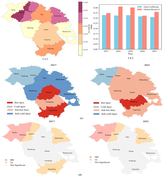 (a) Gini coefficients, (b) Moran’s I, (c) Hotspots, and (d) LISA agglomeration maps of carbon budgets (2017–2021).