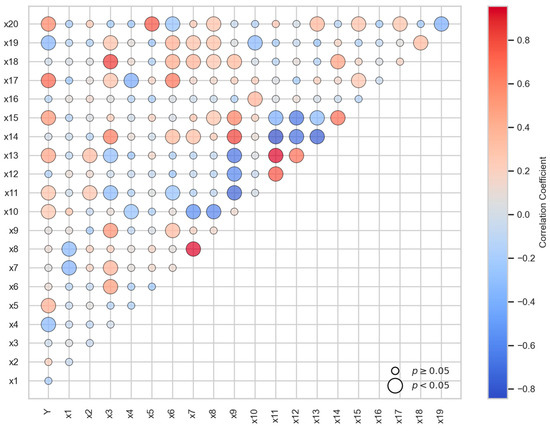 Before constructing the analysis model for the influencing factors of carbon budgets in forest enterprises, it is necessary to explore the correlation coefficients and significance between the carbon budget (Y) of forest enterprises in the Greater Khingan Range and the influencing factors (x1–x20) as well as the correlations and significance among the influencing factors themselves (Figure 7). The results indicated that the absolute value of correlation coefficients r was greater than 0.8 for the following pairs: area of pest occurrence (x3) and afforestation area (x18), average total radiation (x7) and average annual sunshine duration (x8), average annual temperature (x9) and clay content (x14), elevation (x11) and slope (x13), and elevation (x11) and clay content (x14). To avoid multicollinearity among the factors, average total radiation, slope, clay content, and afforestation area were excluded. Among the remaining factors, mechanical fuel consumption (x5), average annual precipitation (x10), elevation (x11), soil pH (x15), forest area (x17), and middle-aged forest tending area (x20) showed a significant positive correlation with the carbon budget (Y) of forest enterprises. In contrast, firebreak construction length (x4) and young forest tending area (x19) exhibited a significant negative correlation with the carbon budget (Y) of forest enterprises.