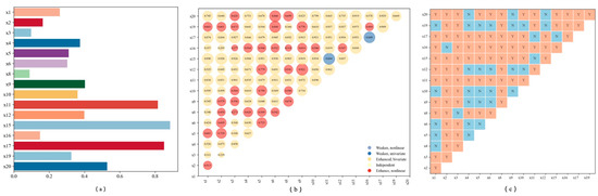 In this study, the OPGD was used to quantify the influence of each key factor on the carbon budget of forest enterprises based on the selected influencing factors from the correlation analysis. First, five different discretization methods, including equal intervals, natural breaks, quantiles, geometric intervals, and standard deviation, were used to optimize the grouping of the influencing factors. Since the distribution of different factors in different intervals is significantly different, it is necessary to choose an appropriate discretization method. In this study, variables such as x2, x3, and x8 were discretized using the quantile method, while x1, x10, and x12 were classified using the natural breaks method. Then, the factor detector in OPGD was applied to calculate the impact value (q-value) of the discretized variables on the carbon budget, as shown in Figure 8a. It is noted that soil pH, forest area, and elevation were the primary influencing factors, with an explanatory power exceeding 80%. In comparison, other factors had a relatively minor impact, with the explanatory power ranging from 9% to 53%. Interaction detectors were then used to assess the explanatory power of paired factors on the carbon budget of forest enterprises (Figure 8b). It can be seen that the dual-factor interaction effects ranged from 22% to 97%, higher than the explanatory power of individual factors. This indicated that there was a certain correlation and synergy between different factors, which jointly affected the carbon budget. The interactions between different factors were mainly manifested as bivariate enhancement and nonlinear enhancement. Finally, the ecological detector was employed to determine whether significant differences existed in the spatial impacts of any two factors on the carbon budget distribution, as shown in Figure 8c, where ‘Y’ indicates significant difference and ‘N’ indicates no significant difference. A total of 86 pairs of influencing factors showed significant differences in the spatial distribution of the carbon budget. Among them, soil pH, forest area, and elevation exhibited significant differences compared to the non-primary influencing factors.