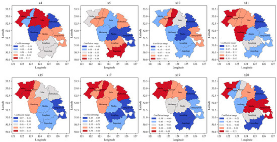 Spatial distribution of regression coefficients for GTWR model.