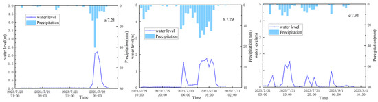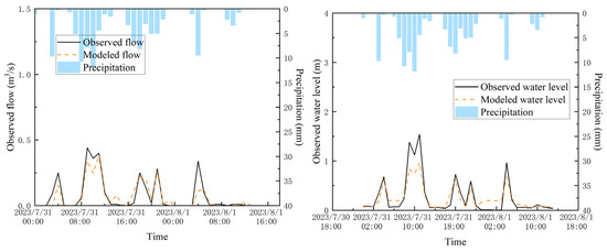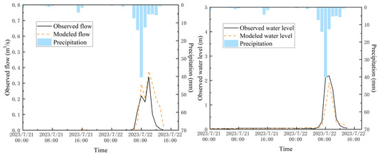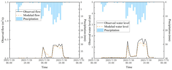 A manual trial-and-error approach was used for parameter calibration to ensure both accuracy and applicability of the model. Two observed rainfall events—July 21, 00:00 to July 22, 14:00, and July 31, 00:00 to August 1, 13:29 (hereinafter referred to as “7.21” and “7.31”)—were selected for calibration. The event from July 29, 11:00 to July 30, 23:59 (hereinafter “7.29”) was used for model validation.