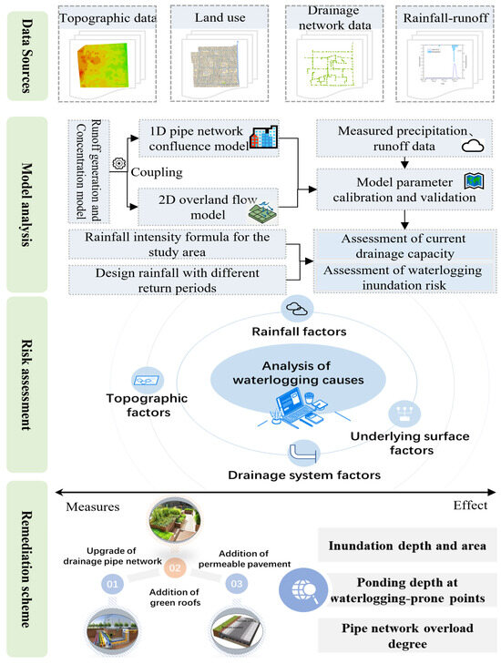 The research framework of this study is shown in Figure 3. Based on stormwater drainage network data, elevation data, and land use information, a rainfall-runoff model and a coupled 1D pipe–2D surface hydrodynamic model were developed [31]. Among the three observed rainfall events, the first two were used for model calibration, while the third event, along with observed inundation depth at a typical waterlogging point, was used for validation. According to the regional storm intensity formula, design hyetographs corresponding to return periods of 1, 2, 5, 10, and 50 years were derived. Each design storm was assumed to last 24 h with a peak coefficient of 0.4. Using the calibrated 1D–2D coupled model, the current drainage capacity of the pipe network was assessed, and inundation processes under various design rainfall scenarios were simulated. Maximum inundation depth maps were generated for each scenario, and the spatial and temporal variations in flood depth were statistically analyzed and compared. To better understand the causes of waterlogging, quantitative analyses were conducted from the perspectives of regional runoff generation and concentration processes, as well as the hydraulic performance of the drainage system. Based on the design rainfall events of different return periods, three categories of engineering measures were considered installation of green roofs, addition of permeable pavements and drainage pipe upgrades. Using a multi-criteria comparison that aims to minimize both inundation area and project cost, optimal combinations of mitigation measures were selected. The performance of each configuration was compared before and after implementation to assess their effectiveness in reducing urban flooding in the study area.